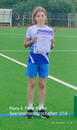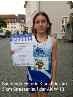 Bei den Saarländischen Straßenlaufmeisterschaften am 20.9.2025 in Ottweiler sicherte sich Klara Fries in der Altersklasse der 13-Jährigen den Titel über 5 km in der Zeit von 22:57 Min.